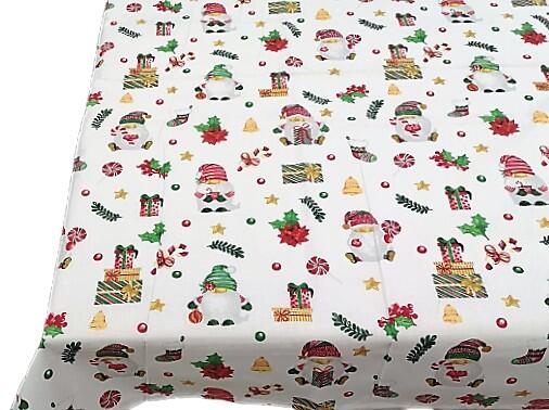 Karácsonyi asztalterítő - abrosz, aranyos ünnepi motívumokkal fehér alapszínen. Téglalap alakú karácsonyi abrosz mérete: 150x220 cm ( +/- 3 cm) Alapanyaga 100% Pamut Mosás: 40 °c