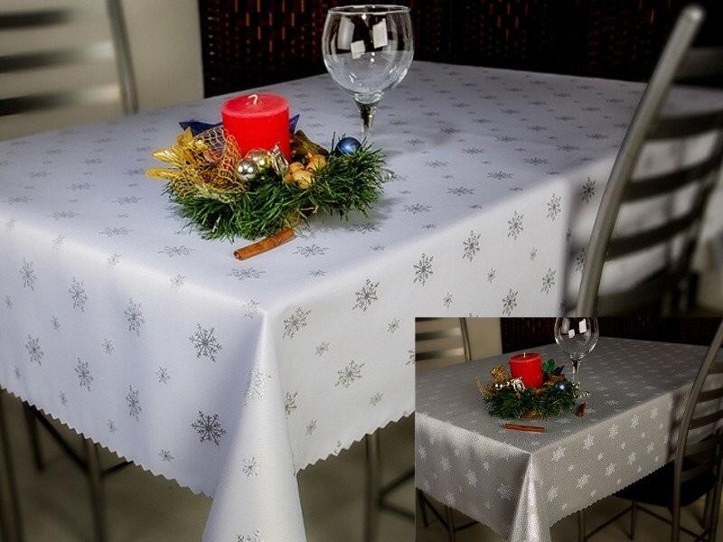 Fehér alapon ezüst hópehely mintás abrosz, Mérete: 140x220 cm Alapanyaga: 100% műszál. 30 fokon mosható. 140x220 cm méretű fehér alapon kétoldalas ezüst hópehely mintás abrosz.
