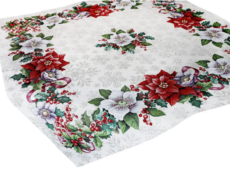 Ez a karácsonyi gobelin terítő az ünnepi díszek gyöngyszeme. Gyönyörű mintája eleganciát és meghitt hangulatot kölcsönöz otthonának az ikonikus karácsonyi virágok - piros mikulásvirág és fehér hunyor - precíz megjelenítésének köszönhetően. A virágokat magyallevelek és bogyók veszik körül, amelyek még több ünnepi varázst adnak a motívumnak.