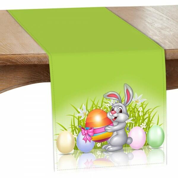 A nyuszi, csirke és húsvéti tojás színes motívumával díszített ünnepi asztali futószalag egyedi dísze a húsvétnak. A színminta úgy van elrendezve, hogy ne túlterhelje, hanem a húsvét szellemét hozza a belső térbe.