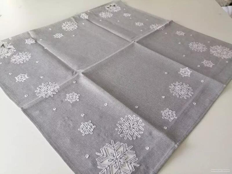 Szürke alapon ezüst hópehely mintás asztalterítő. Mérete: 50x100 cm 50x100 cm méretű szürke alapon ezüst hópelyhes terítő.
