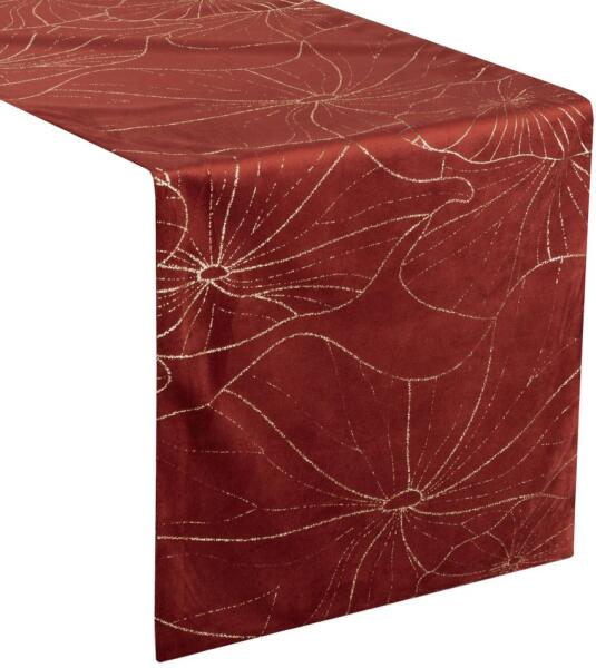 Bársonyszárny, aranynyomással díszítve, tavirózsa levelekkel. Elhelyezkedik az asztal kiegészítő asztalterítőjeként vagy önálló asztalfutóként az asztalra vagy padra. Adjon bájt minden enteriőrnek, tegye egyedivé a terítéket. A teríték klasszikus és csillogó enteriőrökben egyaránt jól mutat. Szélesség: 35 cm, hossz: 220 cm. Szín:tégla. Szemcseméret: 250 GSM. öss