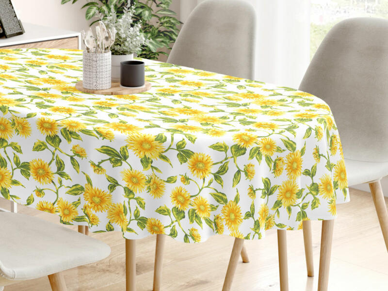 ACHILLEA impregnált modern asztalterítőA ACHILLEA egy sárgavirág mintás impregnált modern megújult külsővel egy igazi kiválóság az asztalterítők között. Hogy miért? Természetes összetételű termék, hiszen 70%-ban pamutból készült! Speciális felületkezelésének köszönhetően bármilyen szennyeződés azonnal, egy vizes szivacs segítségével eltávolítható róla. Sz