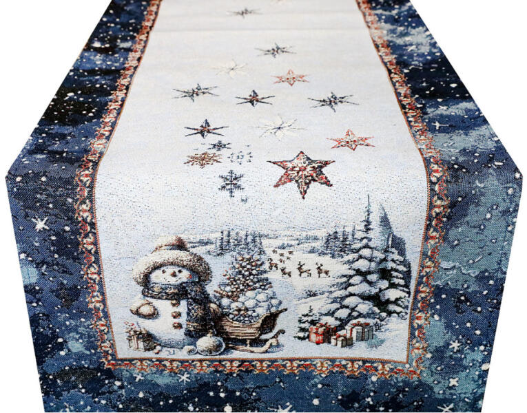 Lurexszel díszített luxus karácsonyi gobelin asztali futó, lenyűgöző téli tájkép és hópelyhek Mikulás motívumával. Ez az elegáns és csillogó terítő ünnepi hangulatot hoz otthonába, és teljessé teszi a karácsony varázsát. Ideális kiegészítő a nappali vagy az étkező dekorálásához az ünnepek alatt.