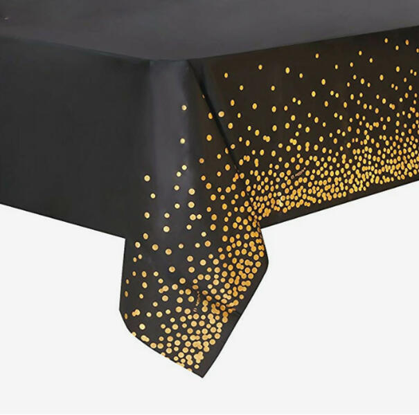 Műanyag , textil hatású, fekete alapon arany pöttyös asztalterítő , mellyel bármelyik születésnapi party-t feldobhatjuk. Anyagának köszönhetően többszőr felhasználható, és egy nedves ronggyal pillanatok alatt tisztítható. Tulajdonságok: Anyaga: műanyag Az asztalterítő mérete: 137 cm × 274 cm