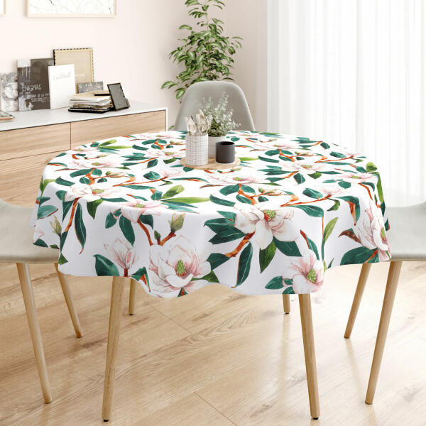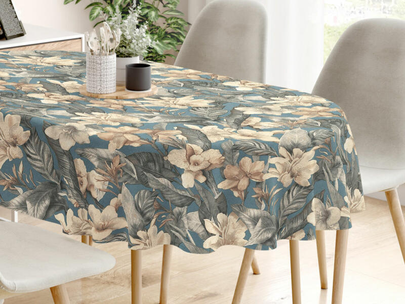 Ekrü alapon világoskék, zöld és halvány rózsaszín hortenzia virágmintás asztalterítő szennytaszító és gyűrődésmentes felülettel. Könnyedén tisztán tartható, gyorsan szárad. Se folt, se vasalás! Tulajdonságok : kellemes tapintású szennytaszító felület vasalásmentes, nem gyűrődik alacsony hőfokon is tisztára mosható rendkívül gyorsan szárad színtartós házia