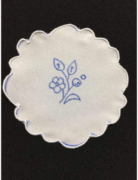 10 cm átmérőjű, kör alakú, szegett szélű (cakkozott), előrajzolt, hímezhető kis terítő, alátét. Az előrajzolt kézimunka a legrégebbi múltra visszatekintő, hagyományos magyar hímzésfajta.