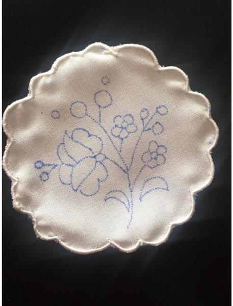 10 cm átmérőjű, kör alakú, szegett szélű (cakkozott), előrajzolt, hímezhető kis terítő, alátét. Az előrajzolt kézimunka a legrégebbi múltra visszatekintő, hagyományos magyar hímzésfajta.