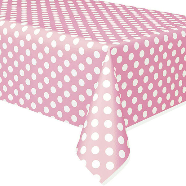 Műanyag , textil hatású, rózsaszín alapon fehér pöttyös asztalterítő , mellyel bármelyik születésnapi party-t feldobhatjuk. Anyagának köszönhetően többszőr felhasználható, és egy nedves ronggyal pillanatok alatt tisztítható. Tulajdonságok: Anyaga: műanyag Az asztalterítő mérete: 137 cm × 183 cm