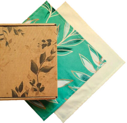Pamut Asztalterítő és Textilszalvéta Szett Díszdobozban - Pasztellzöld színű alapon Divatos Levél mintával és harmonizáló Bézzsel. Szett Tartalma : 1db Téglalap alakú Modern Levél motívummal díszített asztalterítő 150x220 cm méretben. (+/- 3 cm) + Egyszínű Bézs Textilszalvéta - 6 db, 35x35cm méretben. Alapanyaga : 100% Pamut. Mosás : 40 °C-on. Ajándékozza meg Szeret