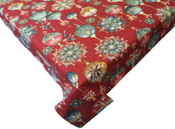 Karácsonyi abrosz karácsonyi gömbdísz motívumok bordó alapon. Téglalap alapú karácsonyi asztalterítő - terítő. Mérete: 150x200 cm (+/- 3 cm) Anyaga: 100% pamut Mosás: 40 °c