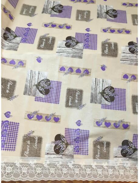 152x122 cm-es, csipkés szélű, levendula mintás, viaszos vászon asztalterítő.