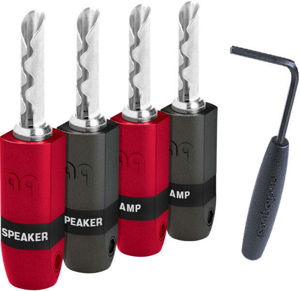BFA standard (British Federation of Audio) banán dugó. A csatlakozó érintkező része kemény, rugalms és kiváló vezető tulajdonságokkal rendelkező Beryllium-réz, 24K aranyozással. Matt fekete házban, csavaros kábel rögzítes, max 10mm2, (7AWG) kábel befogadó mérettel. Az ár egy darabra értendő.