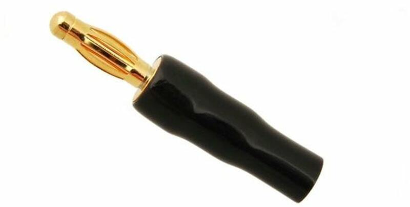 Aranyozott banándugó lehúzható piros vagy fekete lágy PVC szigetelőcsővel. 4 mm2-es kábel fogadására alkalmas. A kábel forrasztással rögzíthető.