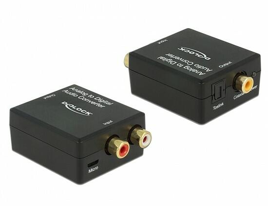 A Delock hangátalakítója egy analóg sztereó jelzést formál át digitális jellé. Két RCA kábel köthető az eszközhöz. A bemenetbe az analóg jelforrás például egy MP3 lejátszó, míg a kimenetbe a jel továbbítása vagy egy optikai Toslink vagy egy S/PDIF koax kapcsolattal történik meg. Műszaki adatok: Csatlakozó: Bemenet: 2 x RCA hüvely 1 x USB Micro-B típusú hüvely (5 V