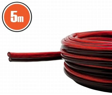 Hangszórókábel 5 méteres 2 x 0,50 mm2, NX20026X5 "OXIGEN FREE" kábel sodrott belső erekkel és transparent piros/fekete szigeteléssel. Belső erek: 2 x (30 x 0,12 mm2) / 2 x 0,50 mm2 Külső átmérő: 2,5 x 5,0 mm Kiszerelés:
