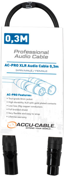 Az AC-PRO sorozat részét képező Accu-Cable AC-PRO XLR Audio Cable 0,3m egy professzionális, 0,3 méteres audiokábel, dugaszolható XLR csatlakozókkal. Szállítási idő:Azonnal szállítható