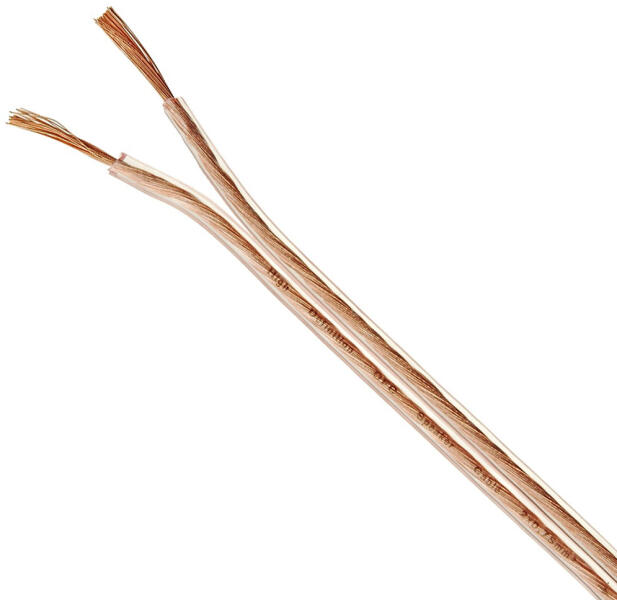 KáCsa® kábelek Expert Line szériájának 0,15 mm OFC szálakból sodrott 2 * 0,75 mm2 keresztmetszetű hangsugárzó kábele átlátszó PVC köpenyben.