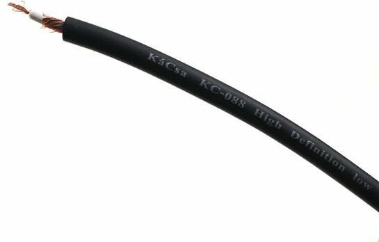 OFC szálakból készített, fehér PVC köpenybe bújtatott és OFC spirállal árnyékolt KáCsa® gitárkábel 5,8 mm átmérőjű fekete PVC köpenyben. A vezető keresztmetszete 0,23 mm2