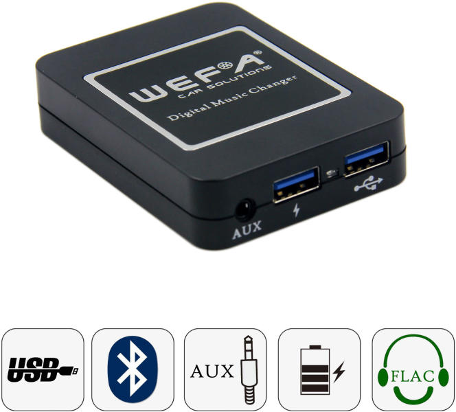 Wefa WF-606 (Peugeot, Citroen, RD4) Bluetooth kihangosító és USB, Aux illesztő. A Wefa WF-606 Virtuális CD-tárként megjelenő, integrált, digitális médialejátszó és telefon kihangosító adapter, Bluetooth A2DP technológiával. Kéznélküli telefonkihangosítás és Bluetooth-on keresztüli sztereo zenelejátszás autójában.