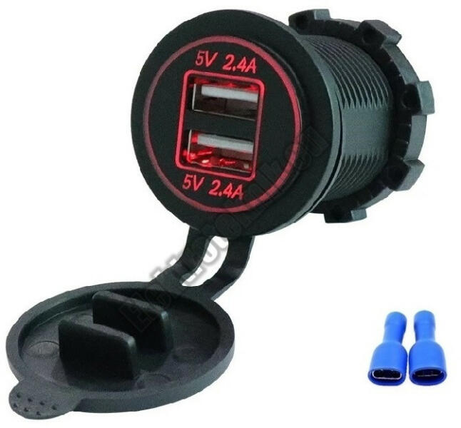 Beépíthető dupla USB aljzat Jellemzők: - Vízálló gumi zárókupakkal - Bemenő feszültség: 12-24V DC - Kimenő feszültség: 5V DC - Kimeneti áram: 5V/2.4A - 5V/2.4A ( 4.8A ) - Piros LED háttérvilágítás - Tartozék : 2 db kábelsaru - Furat mérete: nim. 29 mm - Bliszteres csomagolás