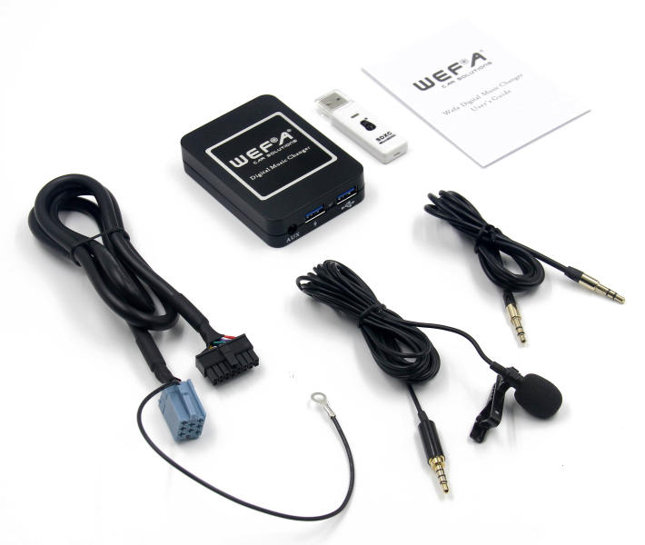 Wefa WF-606 (Volkswagen, Seat, Audi, Skoda Mini ISO) Bluetooth kihangosító és USB, Aux illesztő. A Wefa WF-606 Virtuális CD-tárként megjelenő, integrált, digitális médialejátszó és telefon kihangosító adapter, Bluetooth A2DP technológiával. Kéznélküli telefonkihangosítás és Bluetooth-on keresztüli sztereo zenelejátszás autójában.