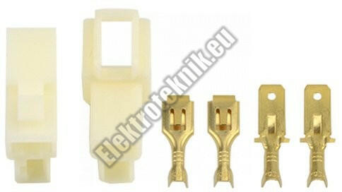 2 pólusú csatlakozó pár Jellemzők: - Névleges áram: 12A - 24V - Üzemi hőmérséklet: -25 ~ 85 ° - Anyag: PVC + réz - Max. vezetékmetszet: 2,5mm2 Tartozék: - 2pár réz 6,3mm csúszósaru - 2db műanyag csatlakozó ház Ideális motorkerékpár, robogó, autó, teherautó, quad, lakókocsi, jet ski, hajók stb.