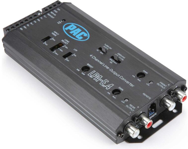 PAC Locpro Advanced magas-alacsony jelszint átalakító remote távirányítóval. 4 csatorna bemenet - 2/4 csatorna kimenet. LPF filter. Max, jelszint bemenet akár 40V / 400W. Állítható terhelés előválasztó gyári erősítős rendszerekhez. Kapcsolható földhurok izolátor. Állítható Max. 9,5V jelszint kimenet. Túlterhelés, Clip visszajelzés.