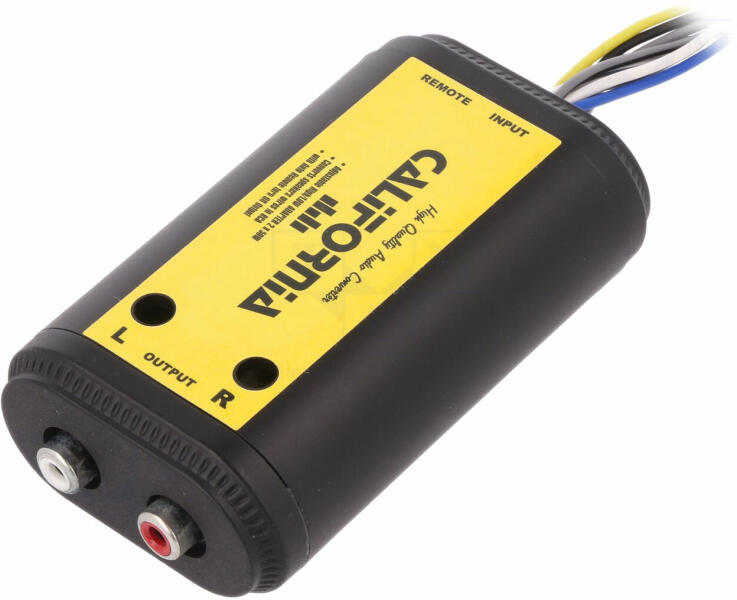 Magas-alacsony jelszint átalakító. Aktív, remote szállal, erősítő bekapcsolás. Oldalanként teljesítményszint szabályzóval. RCA csatlakozás