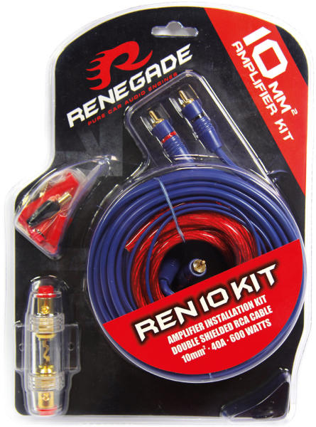 Renegade REN10KIT kábel szett Kábelcsomag hangszórók telepítéséhez Jellemzők: 1 x 10 mm2 tápkábel (piros), rugalmas(0,15 mm), 5 m 1 x 10 mm2 földkábel (szürke), rugalmas(0,15 mm), 0,8 m 1 x RCA sztereó audió kábelt (kék), kétszeresen árnyékolt, 5 m 1 x 0,5 mm2 vezérlőkábel, 5 m 1 x AGU biztosítéktartó, 40 amperes
