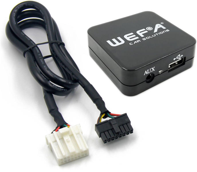 Wefa WF-605 (Toyota 6+6) USB, Aux illesztő. A Wefa WF-605 Virtuális CD-tárként megjelenő, integrált, digitális médialejátszó adapter. Megoldás arra ha MP3, WMA, FLAC típusú hang fájlokat szeretnénk hallgatni az autó gyári rádióján keresztül. CD minőségű hang átvitelre képes az autó gyári fejegységének CD váltó csatlakozóján keresztül.