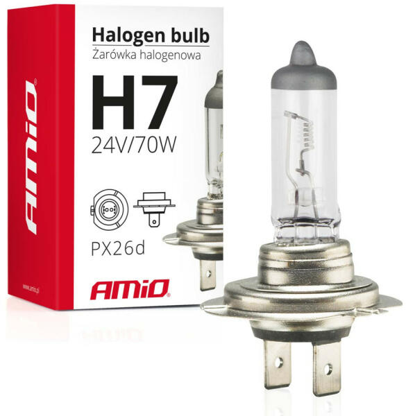 Amio halogén izzó H7 24 V 70 W PX26d UV szűrő Műszaki adatok Foglalat: H7 (PX26d) Feszültség: 24 V Teljesítmény: 70 W Csomagolás: 1 db UV szűrő: igen E1 jelölés: igen