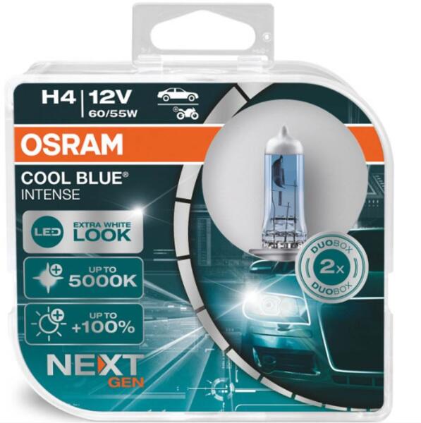 Osram Cool Blue Intense NextGen 5000K +100% H4 55w 2db Az Osram termékcsalád egyik legnépszerűbbb halogén izzó sorozata a CoolBlue Intense . Ezek az izzók 100%-kal erősebbek mint a gyári halogén izzók, illetve speciális kialakításuknak köszönhetően a fény hőmérsékletük is eltér a sima izzóétól. A fénye fehéres, 5000K színhőmérsékletű, ezzel modernebb külsőt kölc