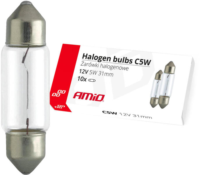 AMIO Halogén izzók C5W szófita 31mm 12V 10db A termék leírása FESTOON C5W 31MM 12V 5W ALKALMAZÁS: BELSŐ VILÁGÍTÁS VÁGÓVILÁGÍTÁS REGISZTRÁCIÓTÁBLÁK VILÁGÍTÁSA JELZÉS: C5W TENGELY: SV8.5 POWER / FESZÜLTSÉG: 5W / 12V 1 csomag = 10 darab