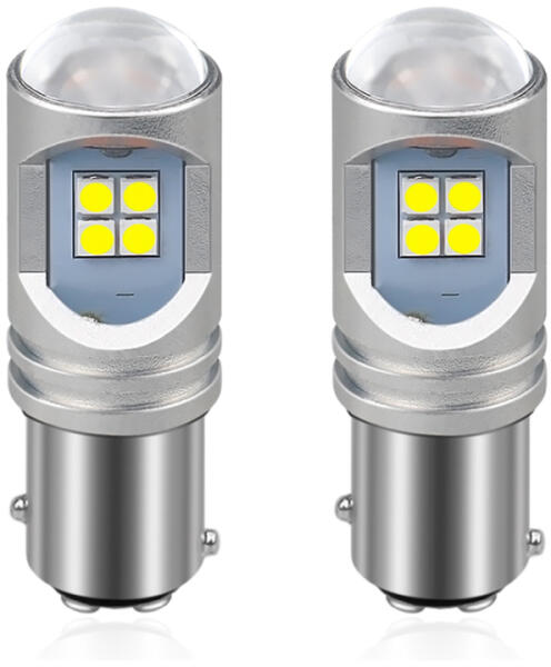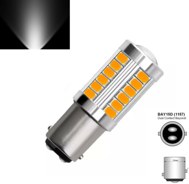 BAY15D led izzó fehér 2dbA led izzó egész burkolata fémből van, így nagyon masszív és kiválóan elvezeti a keletkezett hőt. A vetítő lencse 120 fokban szórja a fényt, így szépen teríti, nem pont szerű mint a régebbi típusoknál. Az izzón 12 darab SMD led található, két oldalt 4-4 SMD led van telepítve, az izzó fején a projektor alatt pedig még 4 db. E jellel nem rendel