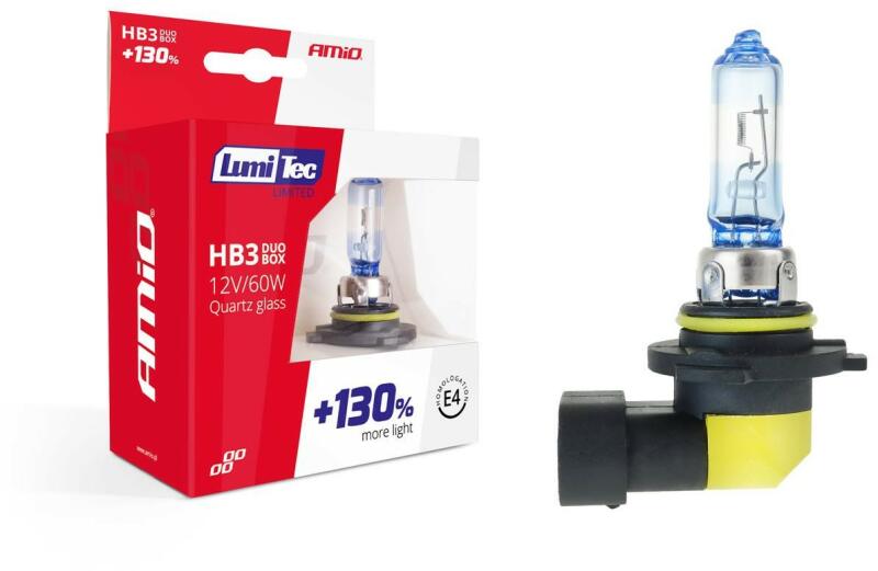 AMIO HB3 halogén izzó 12V 60W LumiTec LIMITED +130% DUO BOX A termék leírása A LumiTec Limited halogénlámpák olyan kiváló minőségű kvarcüvegből készült lámpák, amelyek megfelelő árnyalattal rendelkeznek, lehetővé téve a 4300K ?színhőmérséklet elérését. A gyakorlatban nagyobb hatótávolságú és a nappali fényhez hasonló színű fénysugarat ad, amelyek biztonság
