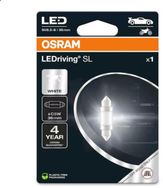 Osram 6418DWP-1BL SV8.5-8 C5W LED Foglalat: C5W ( SV8.5-8) 36mm Feszültség: 12V Teljesítmény: 0.6W Szinhőmérséklet: 6000 K Hosszúság méret: 36 mm Átmérő méret: 10,5 mm