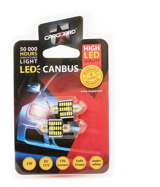 LED féklámpa izzó CAN116 12V 2W Sofit 31mm 2 db / bliszter Típusméret:Sofit: 31 mmFeszültség:12 VTeljesítmény:2 WFényerő:170 lumenLED:18 LED SMD A terméket a helyi jogszabályokkal és előírásokkal összhangban használja. A termék kizárólag közúti vagy közforgalom elől elzárt magánúton közlekedő gépjárműre szerelhető fel. A Vevő ettől csak saját felelősségére,