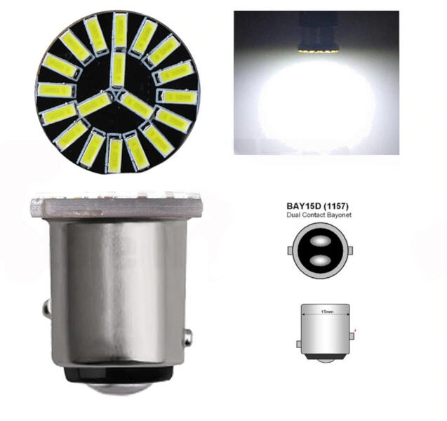 BAY15D led 19smd fehér DC12V Állapot: Új Feszültség: 12V Fogyasztás: 1 Watt Fényerő: 210 Lumen Szín: Fehér Foglalat: BAY15D A BAY15D P21/5W foglalat rendszámvilágításban és helyzetjelzőben található meg.