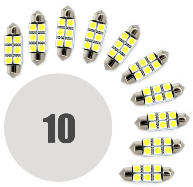 Rendkívül hosszú, 50 000 órás élettartam, 3 év garanciával Fényesebb, mint a normál izzólámpák Foglalat:W5W, C5W, BA9SFeszültség:DC 12VTeljesítmény:3 WFényerő:240 lumenSzínhőmérséklet:6000 KFényforrás:12 db SMD 5050 LED A terméket a helyi jogszabályokkal és előírásokkal összhangban használja. A termék kizárólag közúti vagy közforgalom elől elzárt magánúto