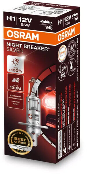A leghosszabb élettartamú OSRAM halogénlámpa A NIGHT BREAKER SILVER az OSRAM optimalizált élettartamú nagy teljesítményű halogén autólámpája. Az OSRAM NIGHT BREAKER SILVER akár 100%-kal több fény nyújt összehasonlítva a minimum követelményekkel és akár 130 méter hosszú fénykévét hozz létre. Ez lehetővé teszi, hogy a vezető korábban felimerje a veszélyeket és aka
