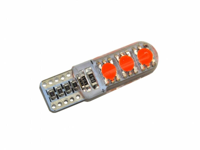 A T10 szilikon típusú LED-et COB diódákkal látták el. A diódák megfelelő elhelyezése biztosítja az optimális fényeloszlást. Az erős fénykibocsátás miatt ennek a típusnak a felhasználhatósága szinte korlátlan, például kiválóan működik csomagtér, utastér, kilépőfény világításként. Tulajdonságok: - megnevezés: T10 foglalat nélküli LED - kibocsájtott fény sz