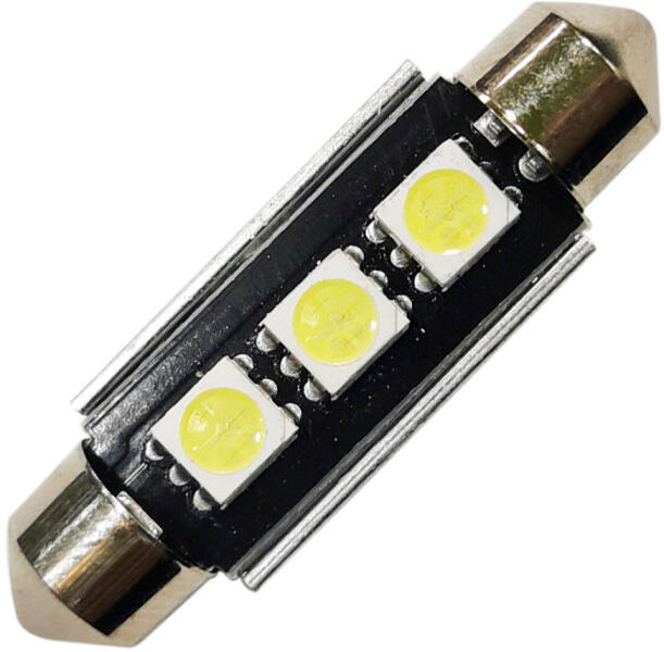 Magas fényerővel rendelkező szofita izzó 3db SMD LED-el, mely belső, illetve kesztyűtartó világításként tökéletes. Továbbá előfordul rendszerámtábla világításként is. Tápellátás: 12V Teljesítmény: ~1,3 Watt Foglalat: szofita Méret: 41 mm Színhőmérséklet: 4100K Fényerő: kb. 99 lumen LED-ek száma izzónként: 3db CAN-BUS: Igen Kiszerelés: darabos Felhasználás: b
