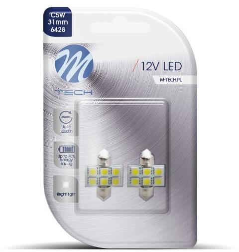 M-Tech C5W, C10W, szofita 31 mm LED 6 dióda fehér színű (pár)Jelölések: C5W, C10W Hossz: 31mm Alapszimbólum: SV8.5 LED-ek száma: 6xLED Dióda típusa: SMD5050 Teljesítmény: 1,44W Feszültség: 12V DCCsere: C5W, C10W, sv8.5, 31mm szofita Kérjük az NKH (Nemzeti Közlekedési Hatóság) ide vonatkozó rendeletét tanulmányozza a LED fényforrások használatára vonatkozóan! Ezen járm
