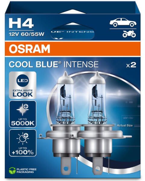 Az OSRAM Cool Blue Intense Next Gen H4 izzók modern és prémium megoldást kínálnak azok számára, akik autójuk fényszórójával tiszta, erőteljes és stílusos megvilágítást szeretnének elérni. A 100%-kal erősebb fényerőt biztosító 60/55W-os H4 izzók hidegfehér fényt bocsátanak ki, amely közel áll a nappali fény színhőmérsékletéhez, így nemcsak az úttestet világ