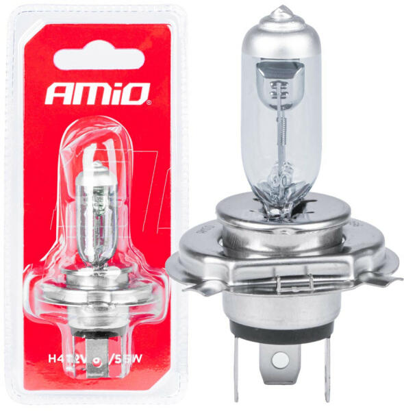 AMIO Halogén izzó H4 12V 60/55W 1db A termék leírása A termék jellemzői: Típus: H4 Alaptípus: P43t Teljesítmény: 60/55W Feszültség: 12V Homologizálás: IGEN Fényáram: 1500Lm ± 10% Kvarcüveg UV szűrővel Töltőgáz: Kripton Test: rozsdamentes acél UV STOP: IGEN Üveg típusa: átlátszó Csomagolás TARTALMA: 1 db.