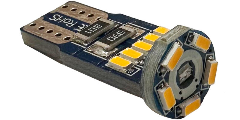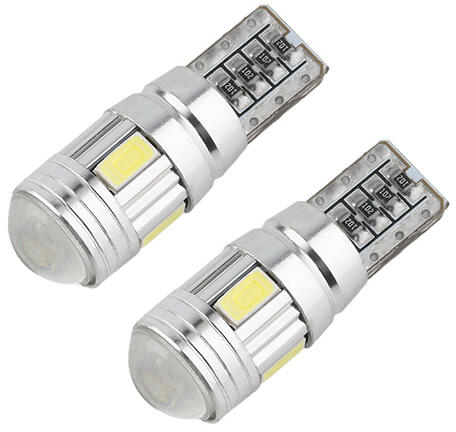 T10 SMD led izzó Canbus projektorosAz izzó hat darab hideg fehér fényű leddel rendelkezik, melyből négy oldalra kettő pedig előre fele világít. Az izzó fémházas ezáltal a hőleadása nagyon jó, és strapabíró burkolat védi az elektronikáját. Az izzó mivel oldalra és előre is világít elsősorban helyzetjelzőbe szoktuk ajánlani. Szépen teríti a fényt így bevilágítja