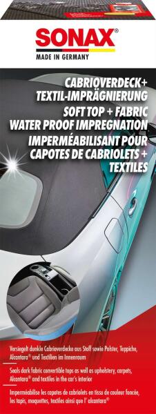 A szövet cabrio tetők, valamint az autó belsejében lévő kárpitok, szőnyegek, textilek és alkantara felületek impregnálásához kifejlesztett speciális szer. A szövet cabrio tetőket vízlepergetővé teszi (impregnálja). Különösen az erősen igénybe vett részeket, mint a hajtások és varratok, védi a nedvességgel szemben. A színeket felfrissíti és véd az újra szennyeződ