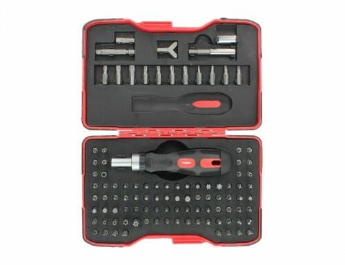 Racsnis csavarhúzó készlet, 101 részes bit készlet. A csavarhúzó 150 mm hosszú, racsnis, irányváltós és rögzíthető. A markolata gumírozott, hegye mágneses, ennek köszönhetően nem esnek ki belőle a csavarhúzó hegyek. A 101 részes csavarhúzó készletet egy praktikus tárolodobozban, a kényelmes tárolás érdekében. Adapterek: 1 db 25 mm-es adapter 1 db 50 mm-es adapter 1
