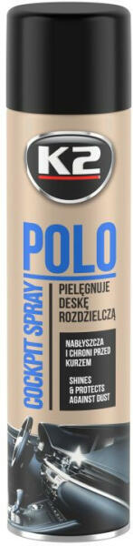 A K2 POLO COCKPIT spray a műszerfal ápolására és tisztítására. A K2 POLO COCKPIT egy spray a műszerfal ápolására és karbantartására. Speciális nanorészecskéket tartalmaz, amelyek gyorsan és egyszerűen megvédik az egész pilótafülkét, és visszaadják a megtisztított elemek mély színét és kifejező textúráját. A termék behatol a megtisztított anyagba, kiemelve a m